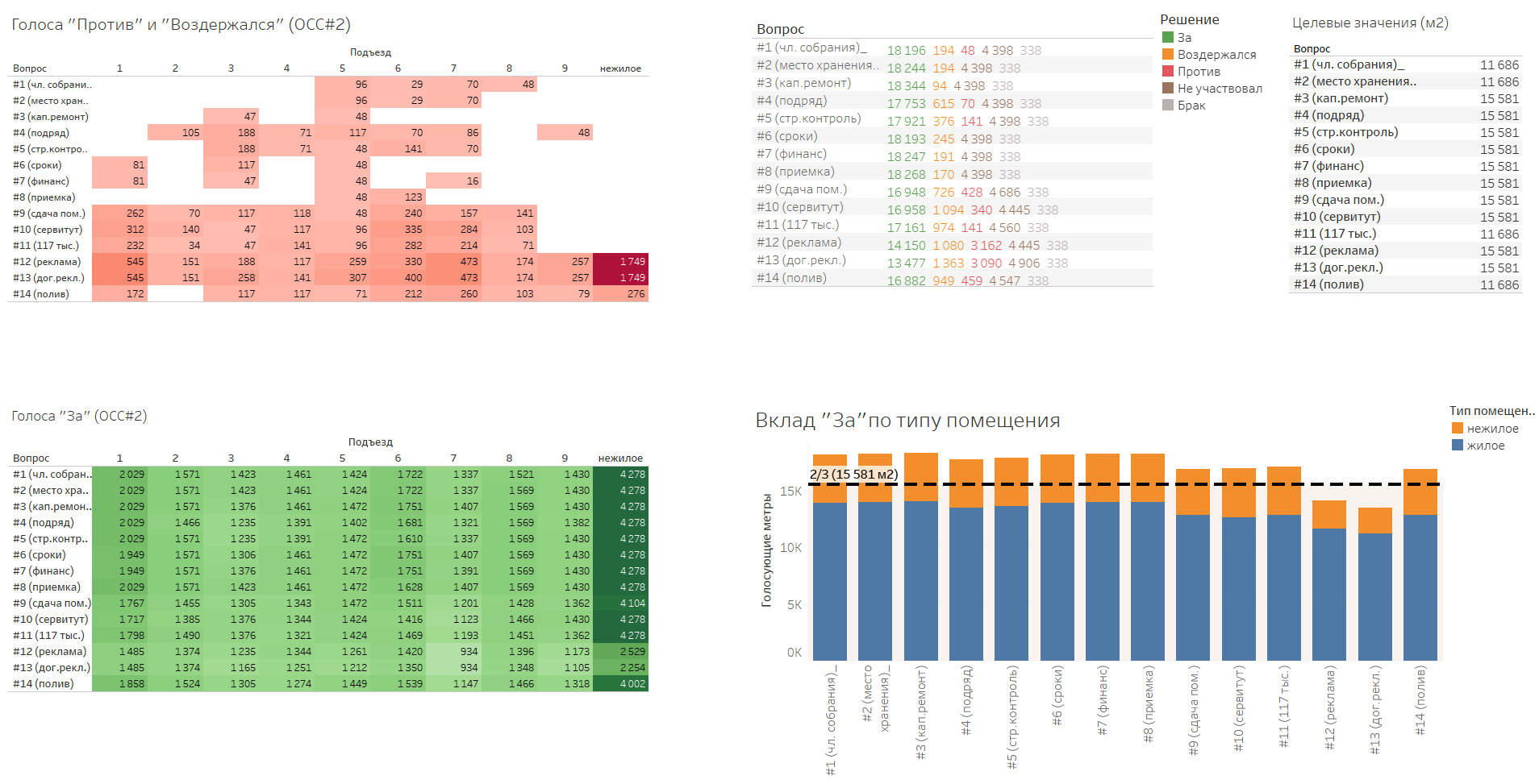 * Обозначение "целевого значения" для вопросов требующих >50% принято условное. При принятии решения оценивается наличие кворума ОСС и наличие голосов "За" от собственников, имеющих площадь >50% от общей площади собственников принявших участие в ОСС (т.е. по факту целевое значение ниже 50% площади дома и определяется количеством участников, принявших участие в голосовании).