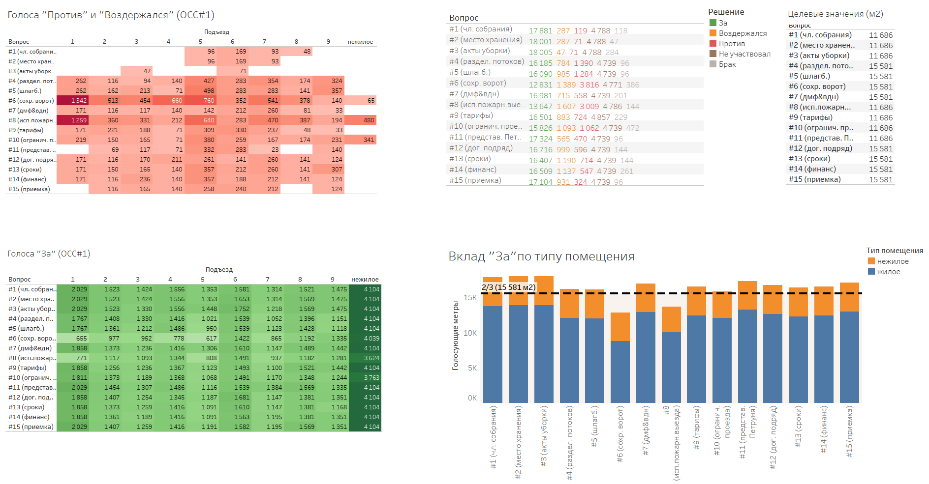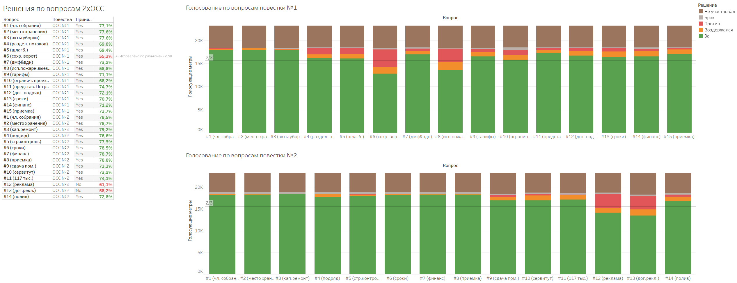 * Обозначение "целевого значения" для вопросов требующих >50% принято условное. При принятии решения оценивается наличие кворума ОСС и наличие голосов "За" от собственников, имеющих площадь >50% от общей площади собственников принявших участие в ОСС (т.е. по факту целевое значение ниже 50% площади дома и определяется количеством участников, принявших участие в голосовании).